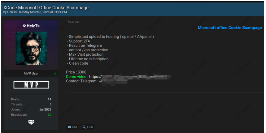 Threat intelligence monitoring has uncovered a new listing on a cybercriminal forum advertising a Microsoft Office "cookie scam page” phishing kit, a tool designed to steal login credentials and active session cookies from unsuspecting users. The kit is reportedly being sold for $300, highlighting how accessible sophisticated cybercrime tools have become in underground markets.