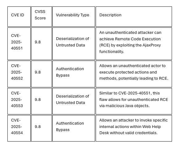 The deserialization flaws (CVE-2025-40551 andCVE-2025-40553) are particularly dangerous because they are "highly reliable" vectors that do not require any user interaction or valid login credentials.