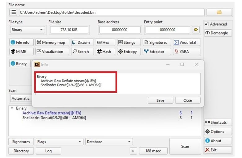 The decoded PowerShell script contains a large byte array that undergoes XORdecryption, revealing Donut-generated shellcode designed forposition-independent execution.