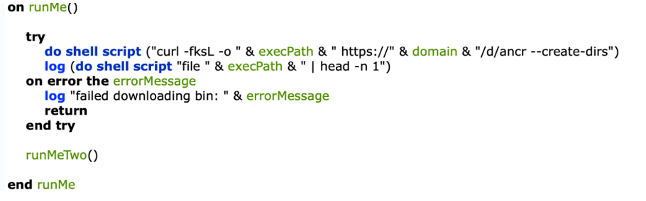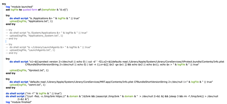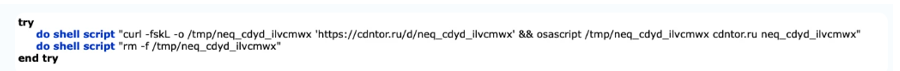 · neq_cdyd_ilvcmwx(File-stealer): A module similar to txzx_vostfdi that exfiltrates files to the C2 server. This module retrieves an additional script from the C2 server, which is saved in the /tmp/ directory.The script is subsequently executed with the domain and module Name providedas parameters. After execution, the downloaded file is deleted. The module operates as a compiled, run-only AppleScript.