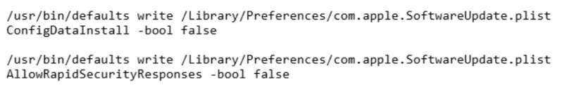 These commands modify macOS Software Update preferences to disable various critical Apple Updates, including Rapid Security Responses (RSR), Security Configuration updates and others.